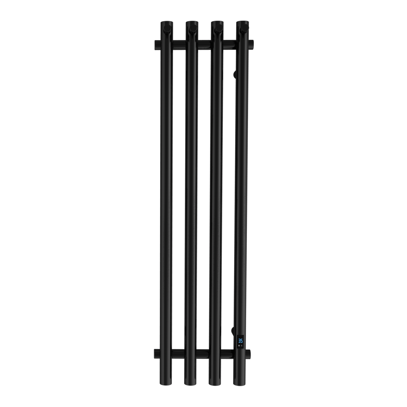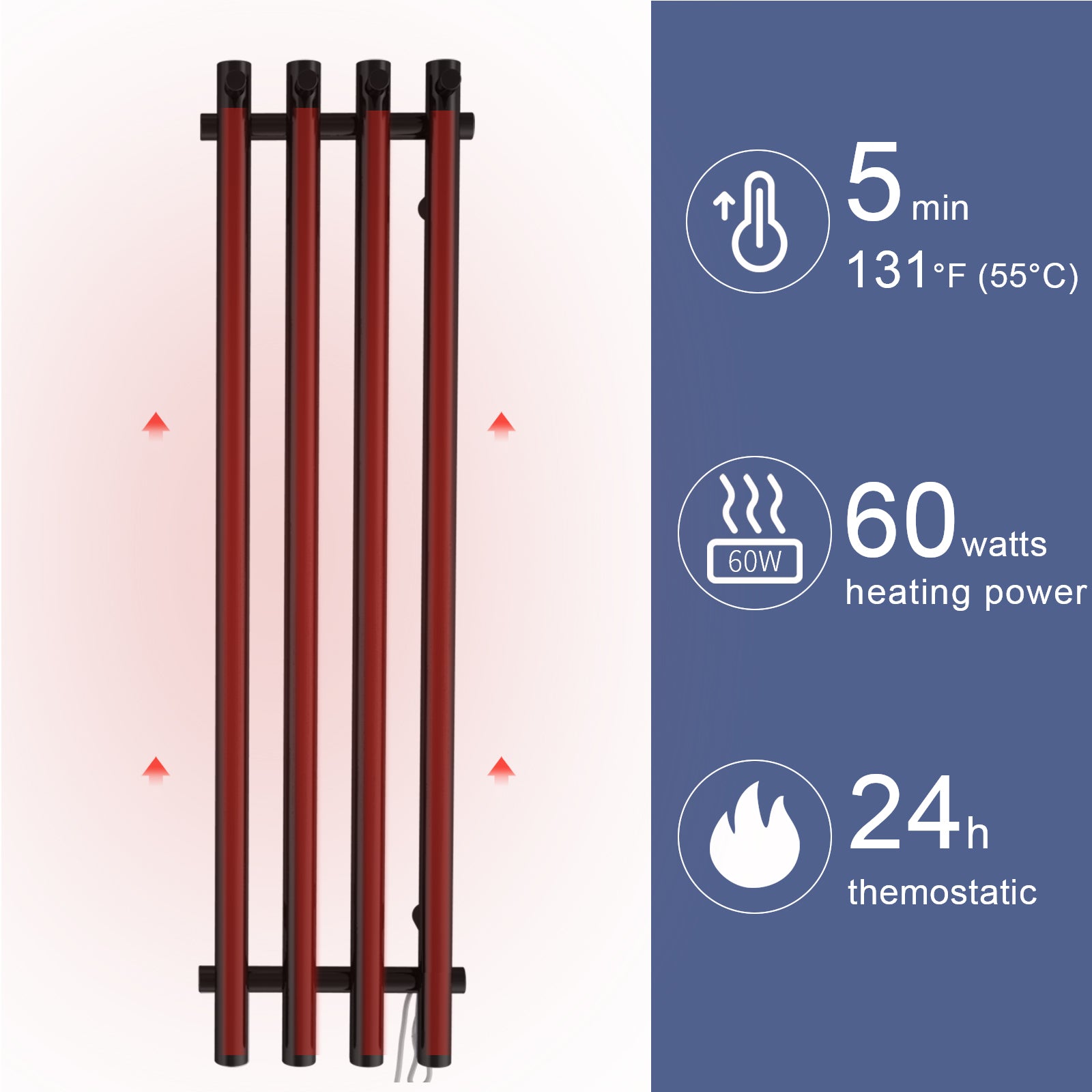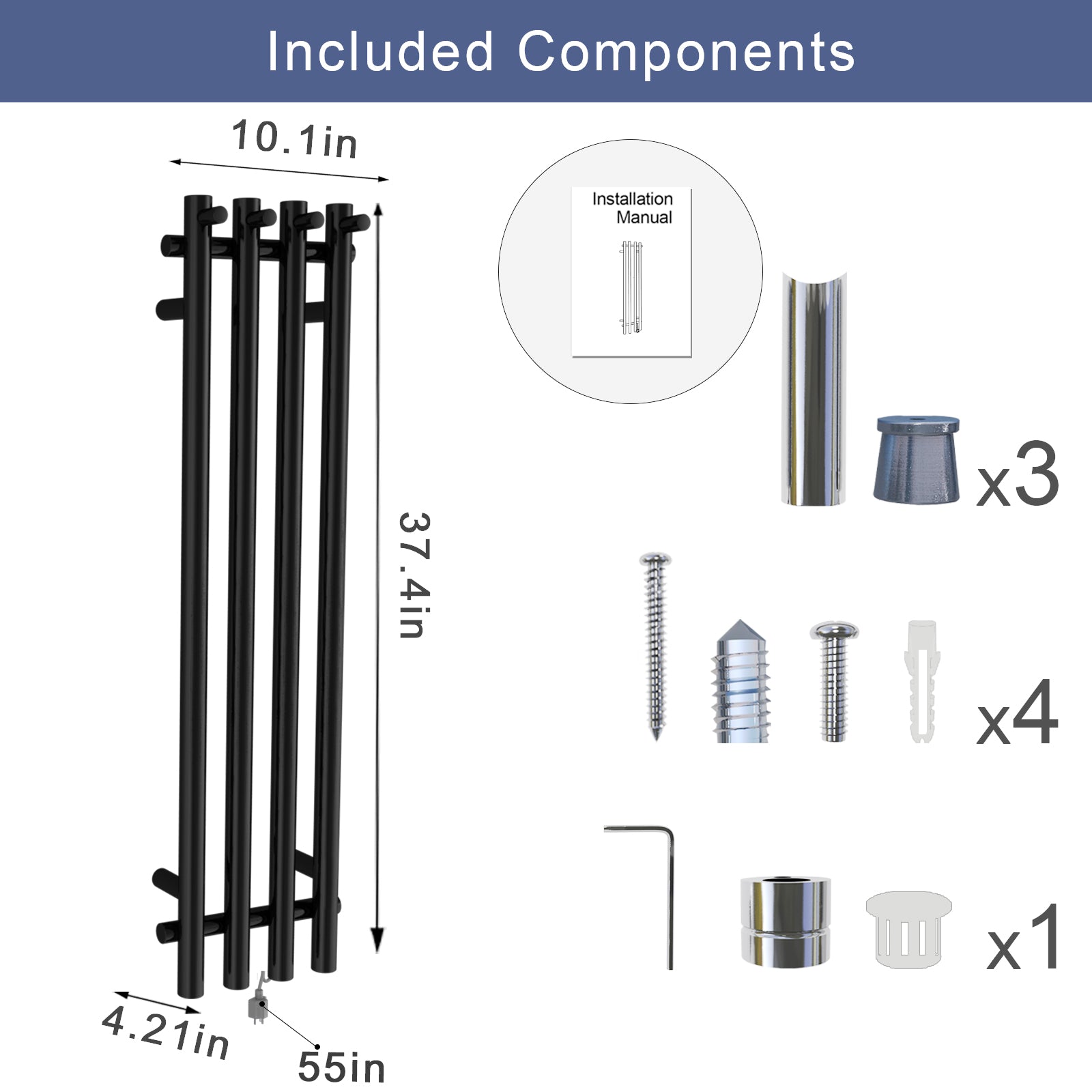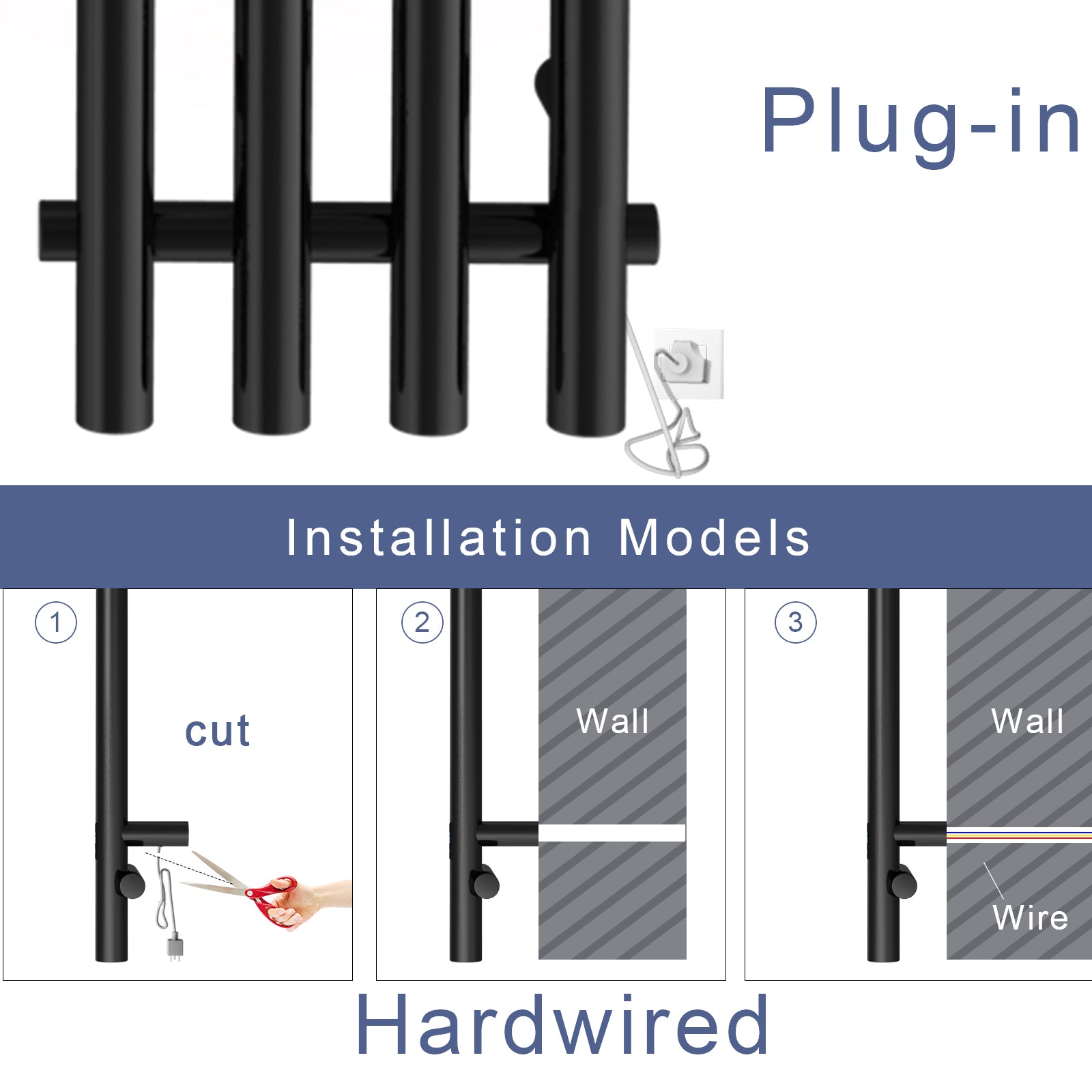 Electric Heated Towel Rack With Timer - Black, Wall-Mounted Towel Warmer, 4 Vertical Bars, Plug-In or Hardwired, Round Luxury Design