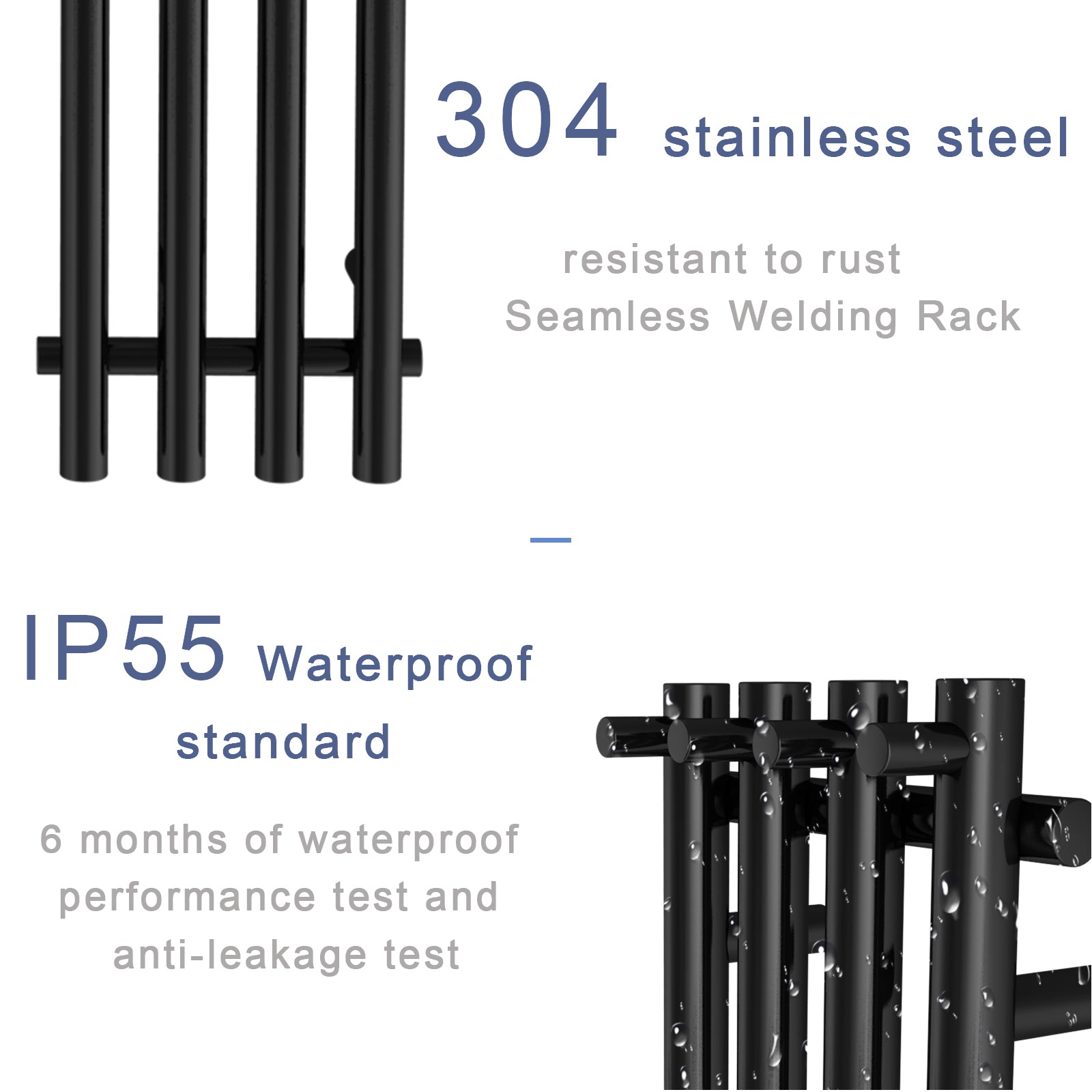 Crafted from premium 304-grade stainless steel, this towel heater offers excellent rust resistance and durability. It has passed 6 months of waterproof and leak-proof testing and meets the IP55 waterproof standard for enhanced safety in humid environments. -