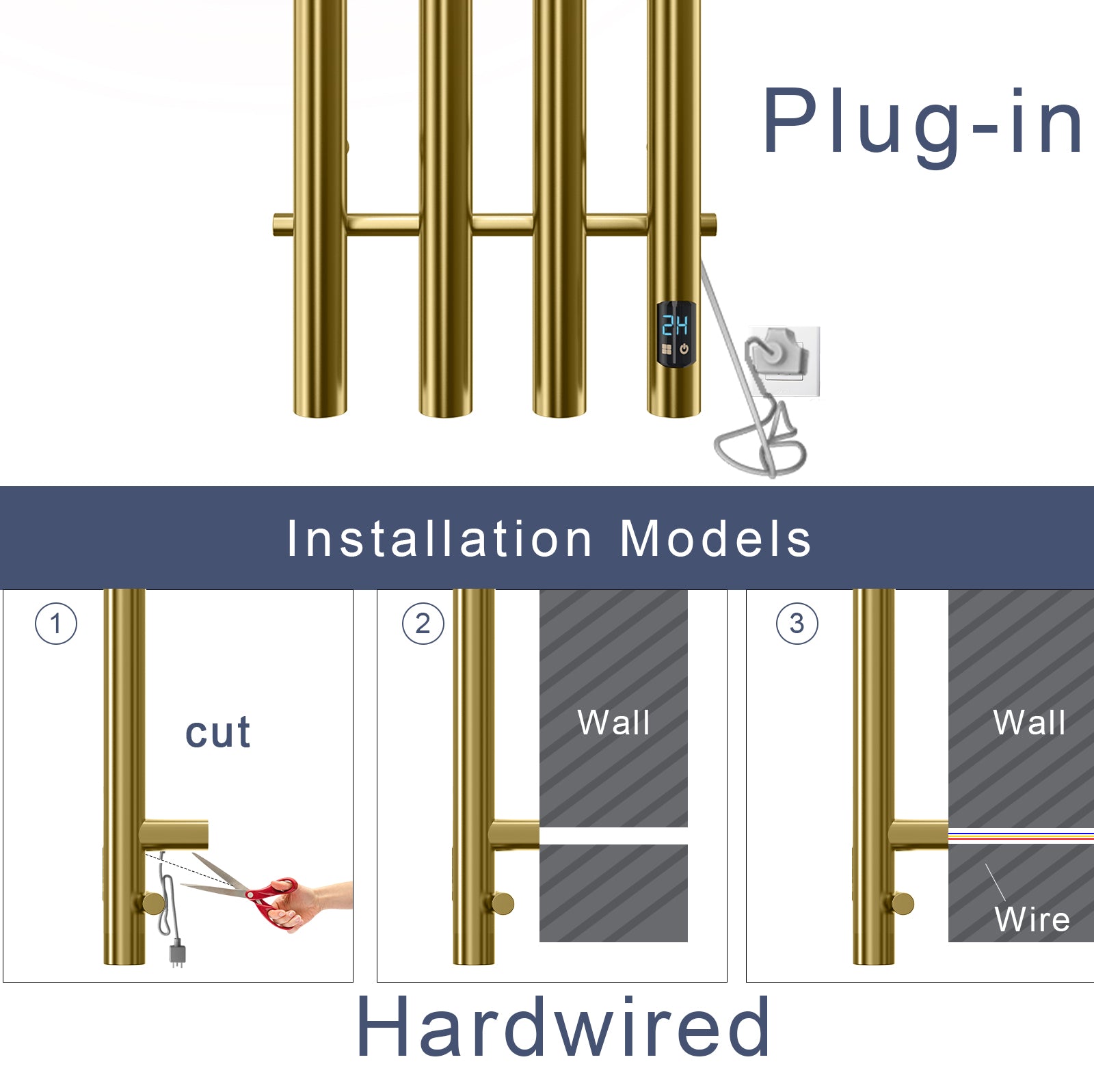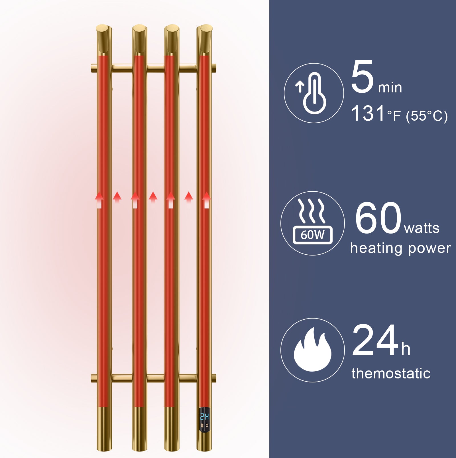 Electric Heated Towel Rack With Timer - Gold, Wall-Mounted Towel Warmer, 4 Vertical Bars, Plug-In or Hardwired, Round Luxury Design