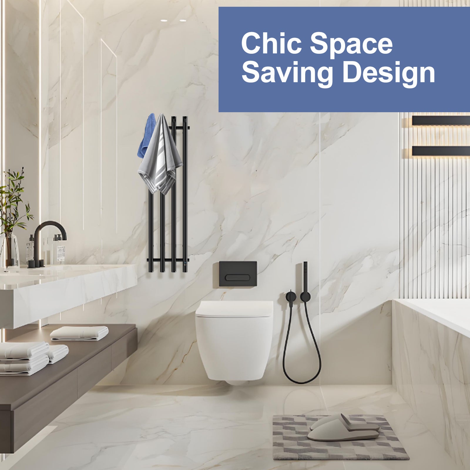Featuring a sleek, minimalist look, our black round heated towel rack complements any bathroom or RV interior. The 4-bar vertical design saves space while adding a sophisticated touch to your walls.